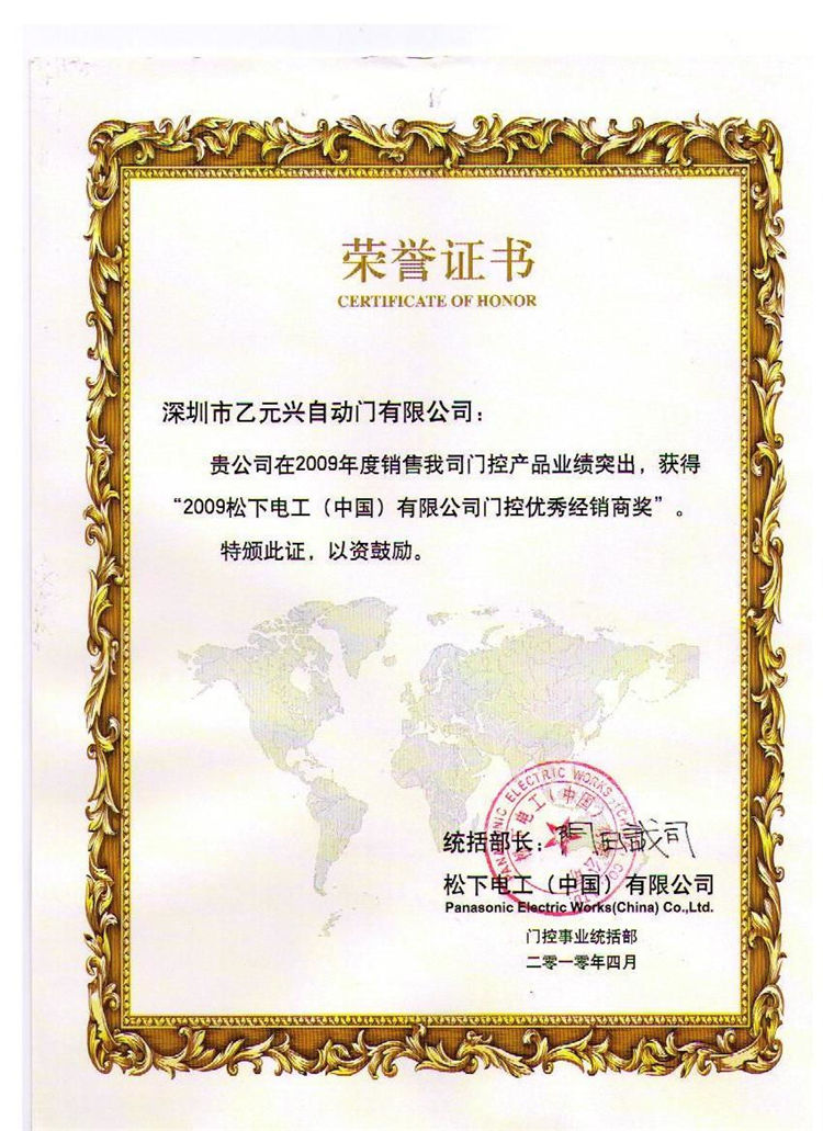 • 松下自動(dòng)門經(jīng)銷商證書
